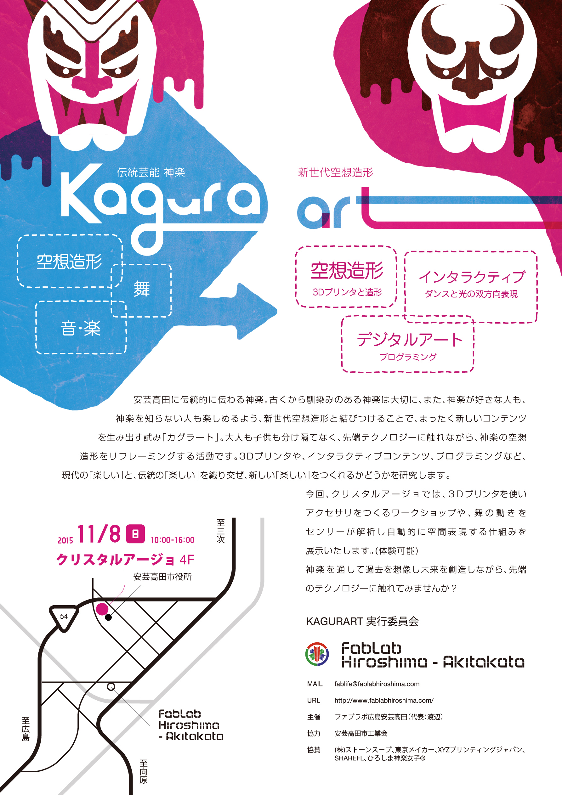 ファブラボ広島安芸高田がある広島県は安芸高田市には、「神楽」という太鼓や笛などを使って演目(空想造形)を舞う伝統芸能が古くから盛んに行われています。現在でも「神楽グランプリ」というNo.1決定戦が毎年行われ、賑わっています。